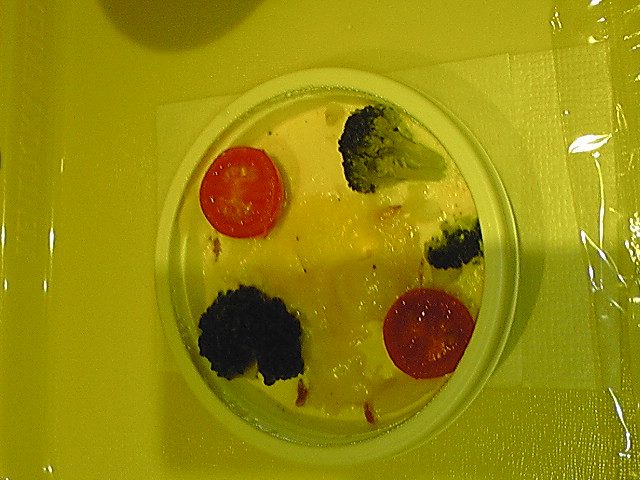上にはとろけるチーズが乗っていて、具はブロッコリー(ちょっと茹ですぎ)、プチトマト、玉ねぎ、ジャガイモ、ベーコン。