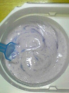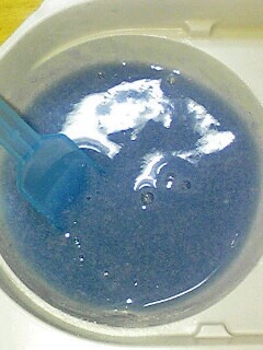 1番目の粉を入れるとブルーだが、2番目の粉を入れるとラベンダー色になる。