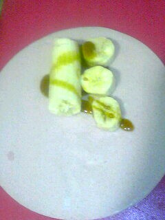 バナナ1本分を適当に配置し、これだけだと地味なのでキャラメルシロップをかけてみた。