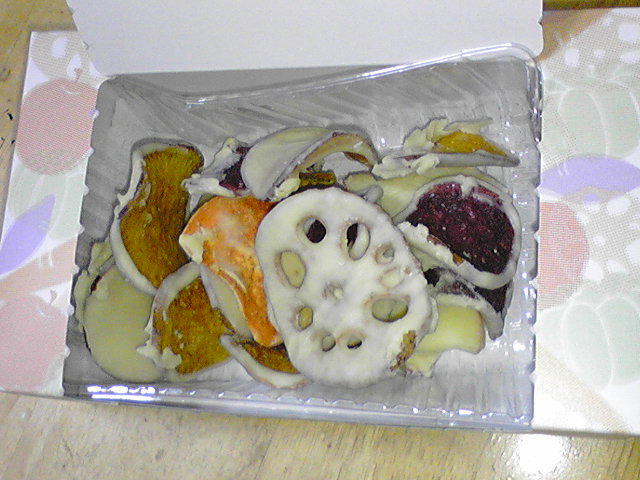 菜種油で揚げてチップスにした野菜や果物にホワイトチョコレートがかかっている。